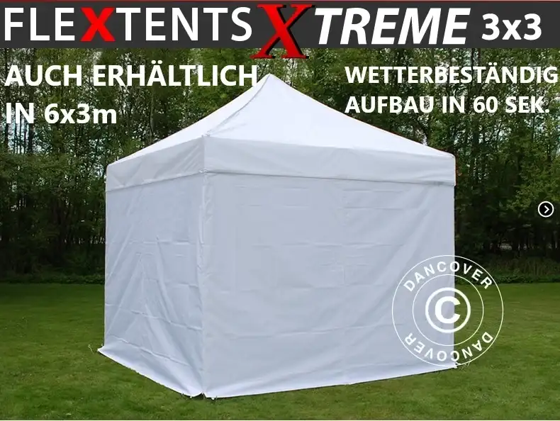 Jetzt Faltzelt FleXtents PRO mieten. Dieser Pavillon ist wasserdicht, UV-beständig und kann in nur 60 Sekunden aufgebaut werden. In der Größe 3×3 Meter bietet die ideale Kombination aus Funktionalität, Flexibilität und Stil. Egal, ob Sie eine private Feier, ein Firmenevent, einen Marktstand oder eine Outdoor-Veranstaltung planen, dieses Zelt schafft einen professionellen und Raum für Ihre Gäste oder Produkte. Hat sich die Sonne mal hinter Wolken versteckt, brauchen Sie Ihre Veranstaltung nicht abzubrechen. Die Seitenteile schützen Sie und Ihre Gäste vor Wind und Wetter