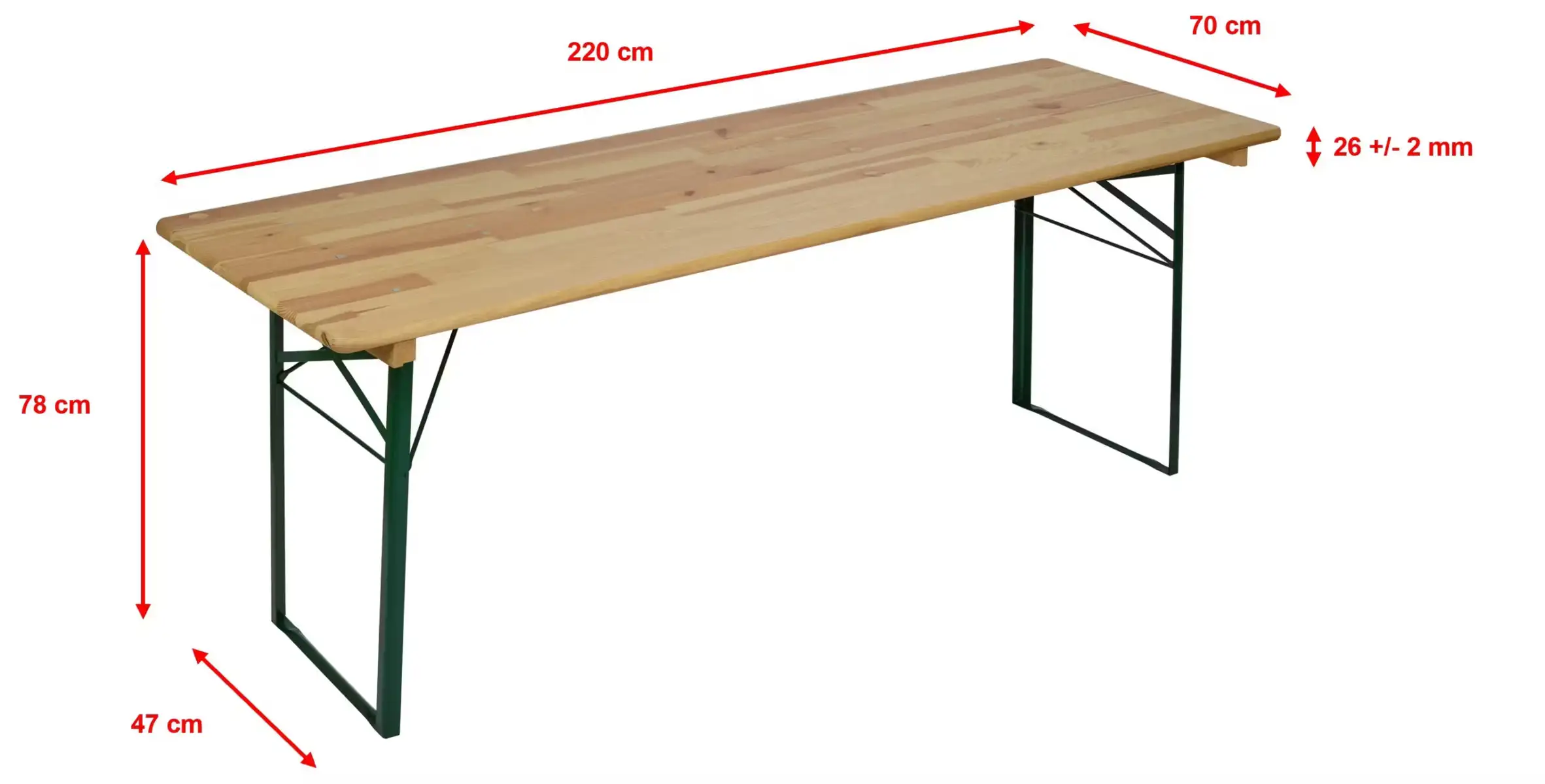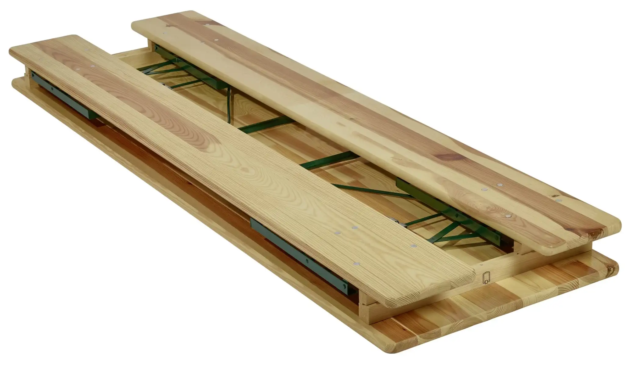 Jetzt die Professional Festzeltgarnitur mieten. Das Set umfasst einen stabilen, extrabreiten Biertisch (224 x 70 x 78 cm) und zwei robuste Bierbänke (jeweils 220 x 25 x 48 cm), die ideal für Veranstaltungen im Freien geeignet sind. Der Tisch besteht aus FSC®-zertifiziertem Kiefernholz mit massiven äußeren Streifen und fingerverzinkten inneren Streifen, was hohe Stabilität und Festigkeit gewährleistet. Die Tischplatte ist 27 mm dick (+/- 1 mm), während die Bierbänke aus massivem Kiefernholz mit einer Dicke von 28 mm (+/- 1 mm) gefertigt sind.