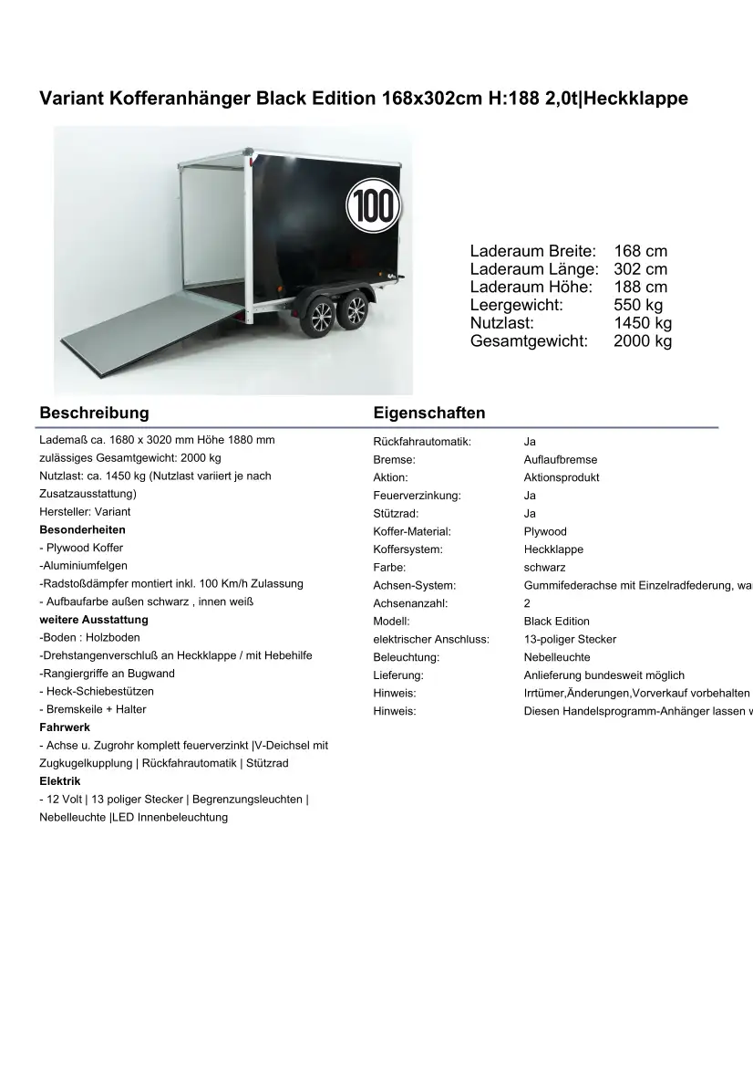 - Zulässiges Gesamtgewicht: 2000 kg